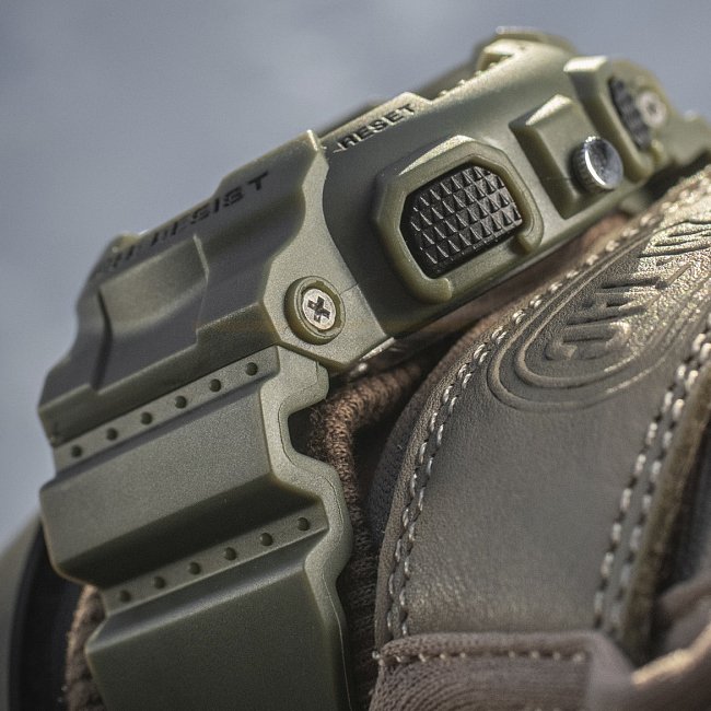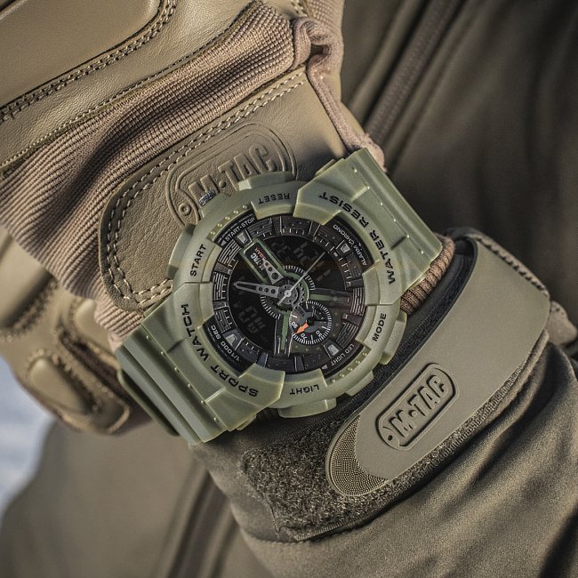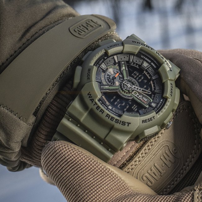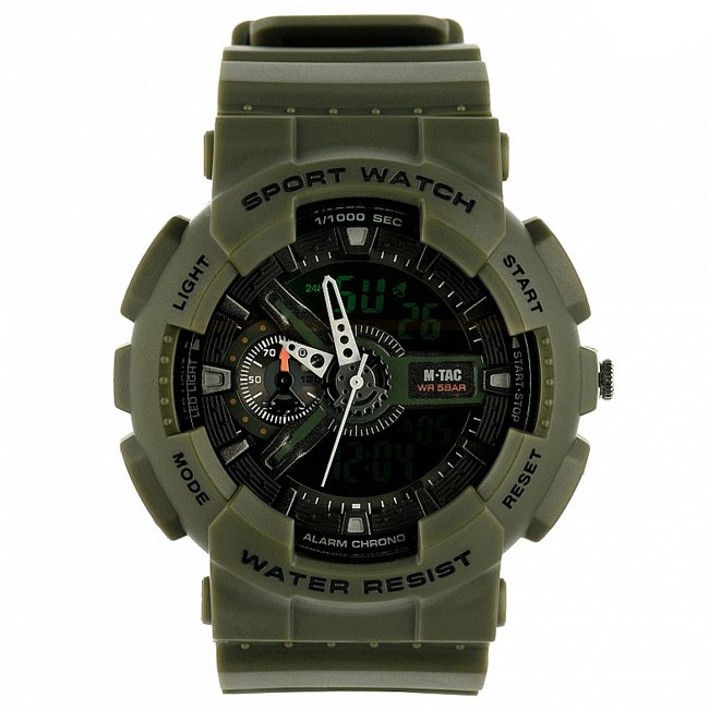 M-Tac Montre Sport - Olive : Montre Sport élégante avec boîtier en polycarbonate durable et verre, étanche, et multifonctionnelle avec format d'heure 12/24, chronomètre, réveil, calendrier automatique, et rétroéclairage LED. Parfaite pour les activités ex