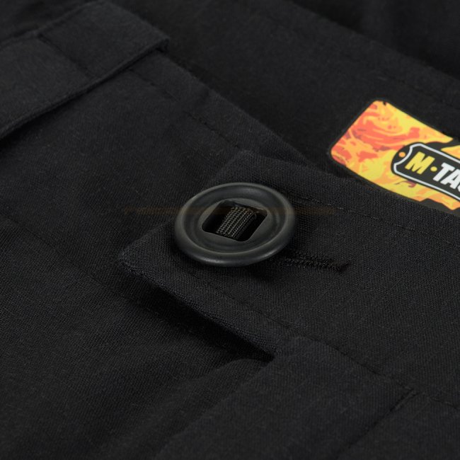 La ceinture du pantalon est réglable à l'aide de sangles en toile, et il est conçu pour être porté avec une ceinture jusqu'à 5,5 cm de large. Il y a deux anneaux en D à l'avant pour attacher divers équipements. La largeur de la zone des genoux est réglable à l'aide de velcro. Un cordon élastique est tendu le long du bord inférieur du pantalon et des fermetures velcro permettent d'ajuster la taille.