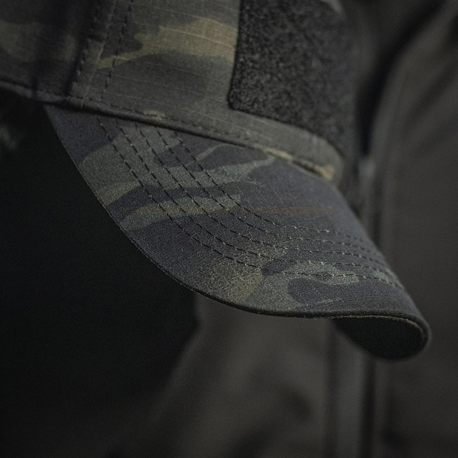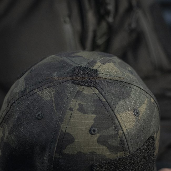 La casquette Tactical Baseball Flex Cap Rip-Stop a six panneaux, cousus à partir d'un tissu indéchirable léger et uni, avec une imprégnation en téflon qui protège de l'eau et de la boue. La visière est dense et garde sa forme. Le fabricant a ajouté un panneau de signature à l'arrière, un panneau Velcro à l'avant, ainsi qu'un panneau Velcro IR sur le dessus. La taille de la casquette peut être ajustée grâce à une bande velcro. Il y a six illets de ventilation sur le dessus de la couronne.