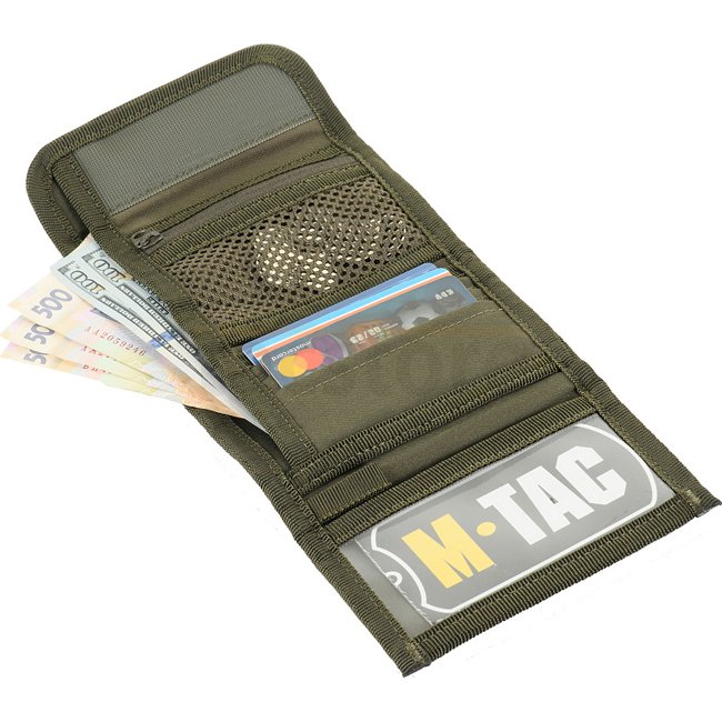 Il a deux grands compartiments pour les billets, des compartiments pour les cartes et des compartiments en plastique pour les documents. Il y a aussi une poche pour la monnaie, qui se ferme avec une fermeture éclair. Le panneau velcro avant vous permet d'attacher divers patchs.