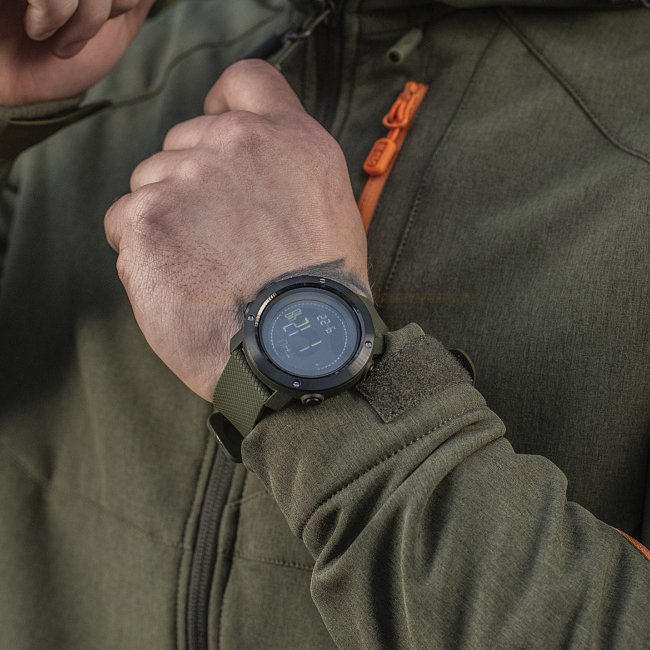 M-Tac Montre Multifonctionnelle Tactique - Olive. La montre ultime pour les sports extrêmes et l'utilisation quotidienne. Surveille la pression atmosphérique, la température de l'air et la santé. Boîtier robuste en polycarbonate, lunette en acier inoxydab