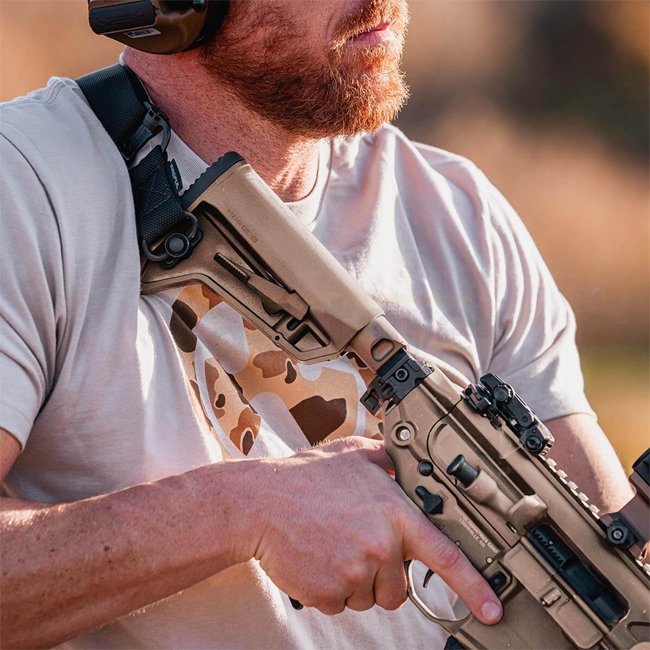 MOE SL‑M Carbine Stock – Mil‑Spec par Magpul est une crosse arrière plug‑in pour tubes de buffer Mil‑Spec AR‑15/M4. Conçue pour les configurations type PDW, elle présente un profil plus court et fin optimisé pour les extensions de boîtier de longueur PDW. Le tampon caoutchouté antidérapant et l’ergot incliné facilitent les transitions à l’épaule, même en portant un gilet ou équipement modulaire. Le levier de déverrouillage ambidextre protégé minimise les bruits de jeu sans accessoires additionnels. Comprend une boucle de fixation de 1,25 inch (~ 32 mm) compatible M‑LOK QD Sling Mounts. Fabriqué aux USA.