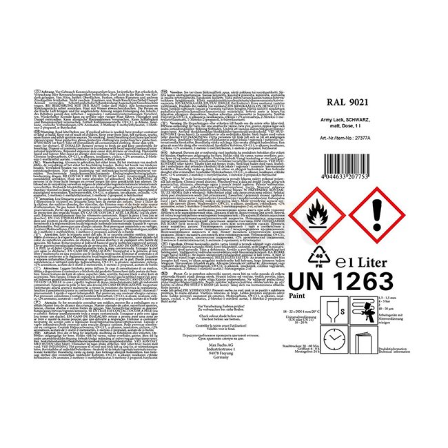 résine synthétique de séchage rapide durable, pour interieur et extérieur grand opacité grande résistance aux UV et aux intempéries diffusion excellente, grande dureté finale résistant aux températures, pour tous les surfaces s.v.p. notez les instructions de securité! RAL9021 application: procédé de pulvérisation en dilution de 10 - 20 % procédé pour peindre sans dilution dilution: DILUANT UNIVERSEL (dilution UN ou UN 21 10 - 20 %) nettoyage: nettoyer les outils avec diluant nitro temps de séchage: sec hors poussière 30 - 60 min sec au toucher 6 - 8 h, complètement sec 24 h Quantité maximale par commande = 22 pièces