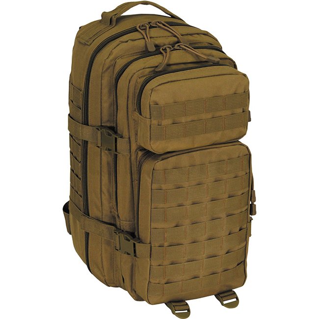 Sac à dos MFH Assault 1 Basic - Coyote : Bretelles ajustables et rembourrées, ceinture détachable, compartiment pour système d'hydratation, rembourrages en maille respirante, multiples compartiments et poches, boucles d'attache Molle, capacité de 30 l. Ma