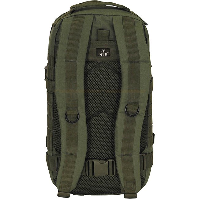 Sac à dos MFH Assault 1 Basic - Olive : Bretelles réglables et matelassées, sangle de taille détachable, compartiment pour poche d'hydratation, rembourrages en maille respirante, plusieurs compartiments et poches, boucles d'attache Molle. Capacité : 30l.