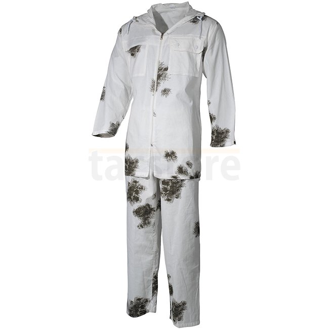 Vêtements de camouflage MFH BW - Camouflage neige - S/M : Veste et pantalons réversibles en design camouflage blanc et neige, avec fermeture éclair avant, poche poitrine, extrémités de manches réglables, capuche avec cordon de serrage, ceinture, braguette