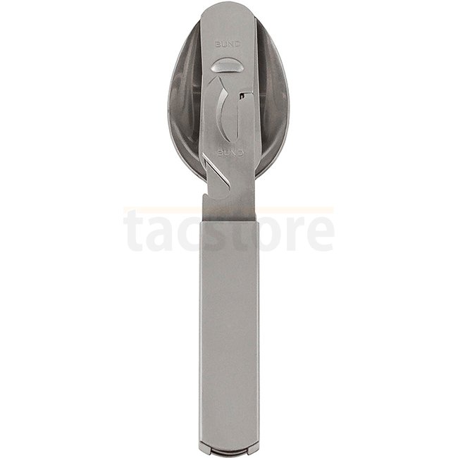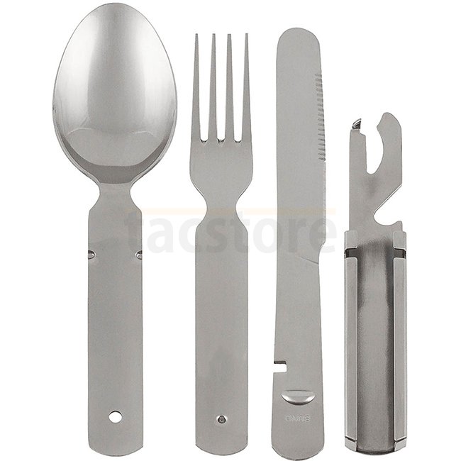 Ensemble de couverts MFH BW Version lourde : Couteau, fourchette, cuillère, ouvre-boîte/ouvre-bouteille. Longueur : 19 cm. Poids : 200 g. Acier inoxydable à 100 %.