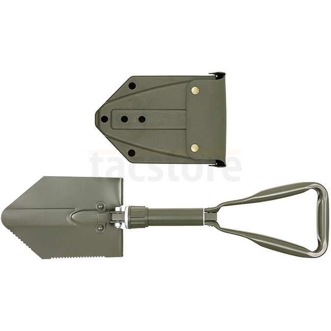 Pelle pliante MFH BW de haute qualité en olive avec un manche et une lame en acier durables. Peut être utilisée comme une houe, possède un bord denté, et se plie facilement avec un verrou à vis. Livrée avec une couverture de pelle avec fixation de ceintur