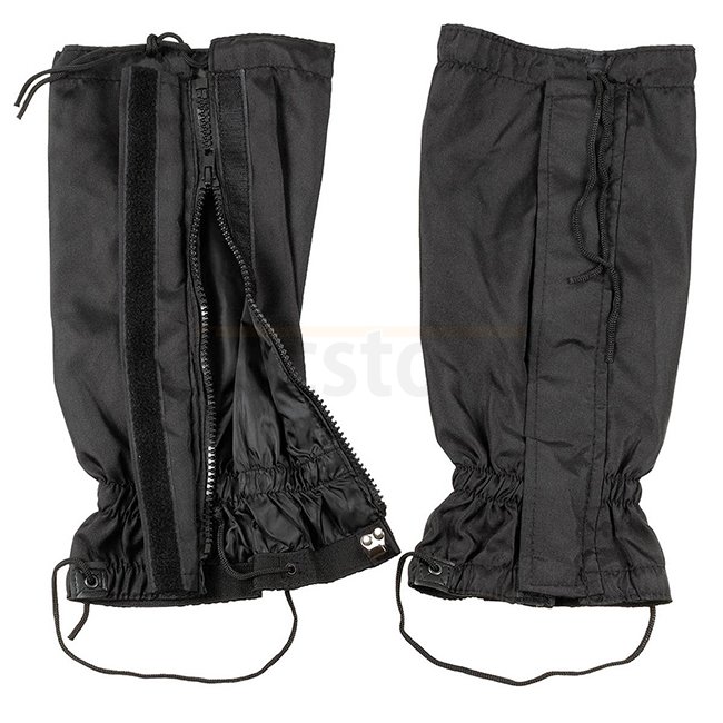 MFH BW Guêtres - Noir : Fermeture éclair dissimulée, velcro et cordon de serrage ajustable pour protection. Fabriqué en matériau extérieur 100 % polyester et doublure 100 % polyuréthane.