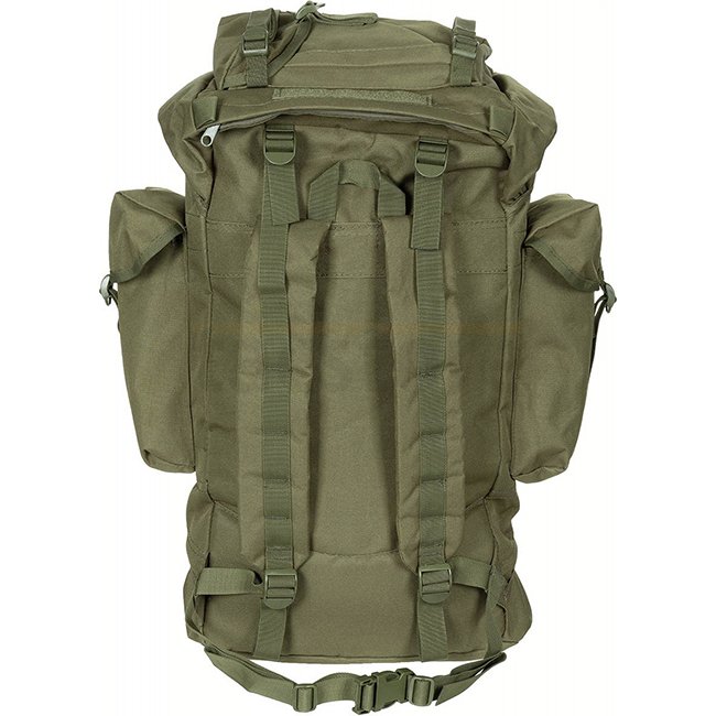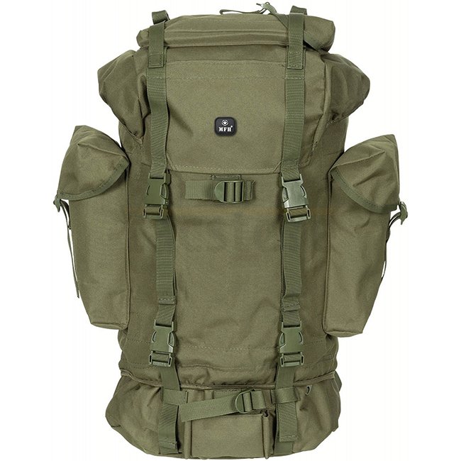 Sac à dos de combat MFH 65 l - Olive - Bretelles réglables et rembourrées, ceinture, multiples compartiments, diverses poches, matériau polyester robuste.