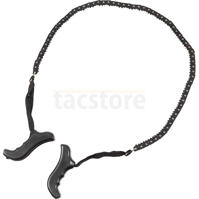 Scie à chaîne manuelle compacte et légère idéale pour les aventures en plein air. Présente des maillons en métal rivetés avec des dents durcies et des poignées en plastique ergonomiques. Livrée avec un sac de transport pratique. Longueur totale d'environ