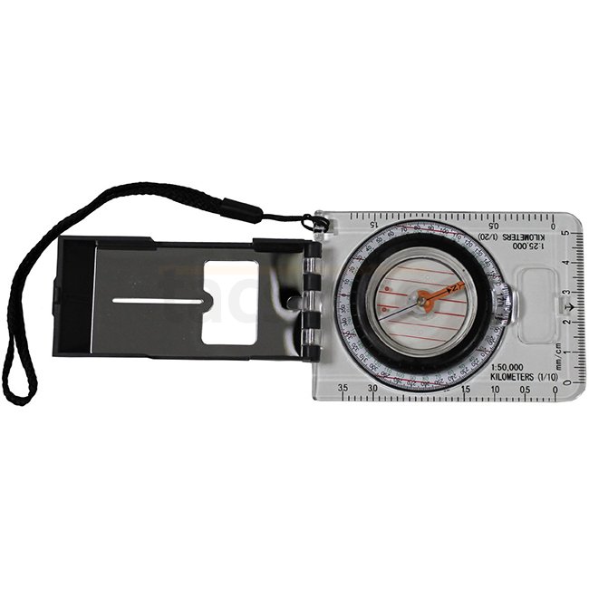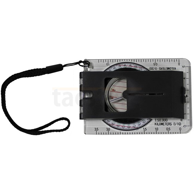 Compas à boîtier rotatif amorti par liquide avec graduation à 360°, couvercle miroir, loupe, échelle de mesure et cordon de transport. Dimensions : environ 9 x 6,5 x 2 cm. Poids : environ 70 g.