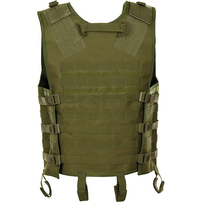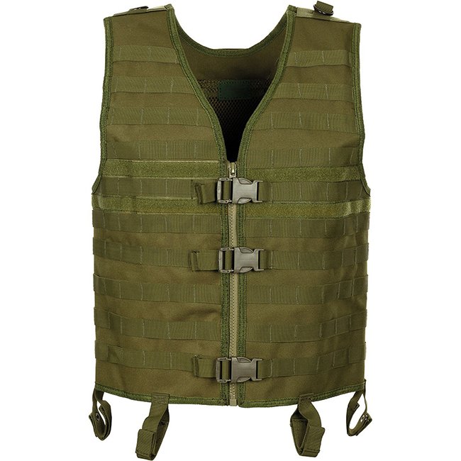 Gilet tactique avec système modulaire, doté d'une fermeture éclair robuste à l'avant avec fermeture à clip. Réglable en hauteur sur l'épaule par velcro et anneau en D métallique. Passants d'attache Molle sur tout le gilet, avec des panneaux velcro sur le