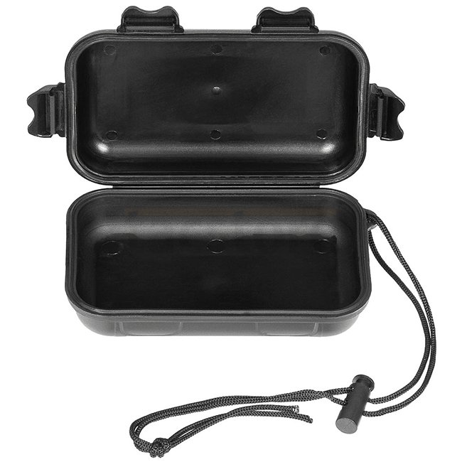 Boîte en plastique MFH compacte et durable en couleur noire élégante. Comprend un couvercle en plastique antichoc avec un joint en caoutchouc, 4 verrous à pression et une sangle de transport pratique. Dimensions externes environ 13,5 x 8 x 3,7 cm. Dimensi
