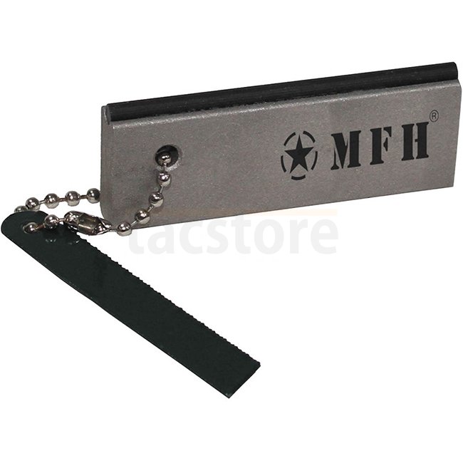 MFH Professional Fire Starter : démarreur de feu en 2 parties avec acier à feu intégré, chaîne et grattoir pour un allumage facile. Dimensions : env. 7,5 x 3 x 1 cm. Fabriqué avec du lanthane, du cérium, du cuivre, du fer, du zinc et du magnésium.