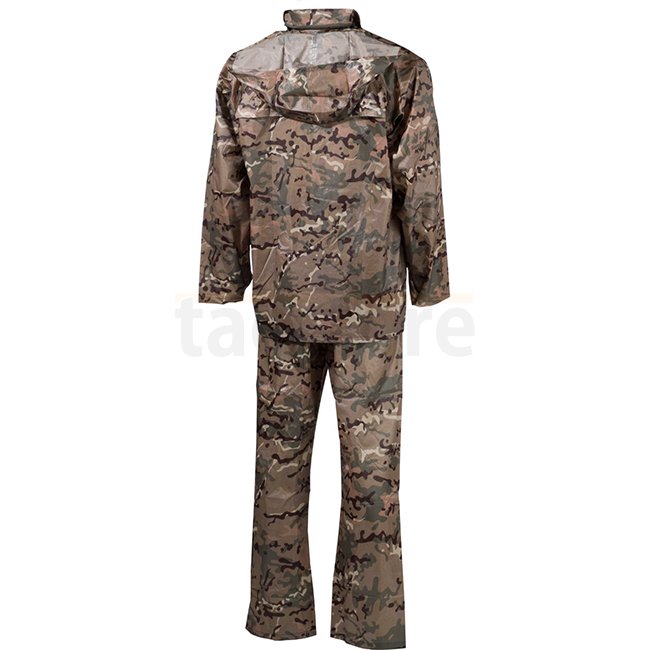 Costume de pluie MFH en deux pièces en camouflage opérationnel - Veste avec zip dissimulé et boutons-pression, capuche cachée, ventilation dans le dos, et plus. Pantalon avec taille élastique, ourlet inférieur ajustable. 100% Polyester.
