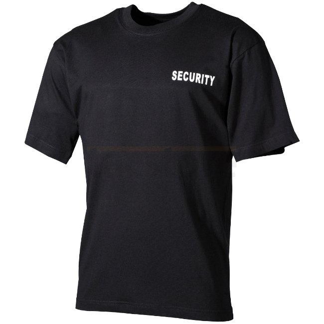 T-shirt MFH Security imprimé en noir, taille 4XL. Caractéristiques de l'impression "SECURITY" à l'arrière et sur la poitrine, col ras du cou renforcé. Fabriqué en 100% coton, 160 g/m2.