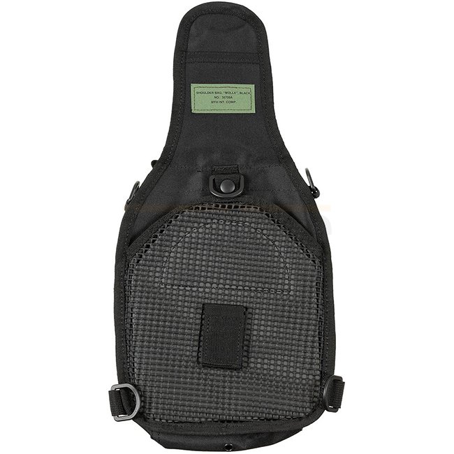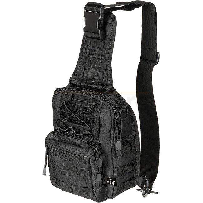 Sac à bandoulière MFH MOLLE - Noir : Bandoulière réglable et amovible avec fermeture à clic, partie arrière rembourrée, 1 grand compartiment à glisser, 1 petit compartiment à glisser, bande velcro, anneau en D à chaque coin, poignée de transport supérieur