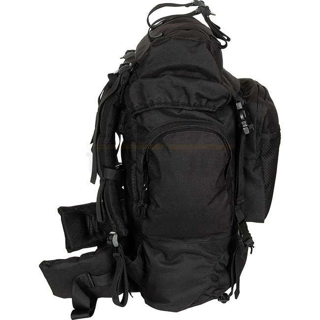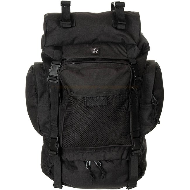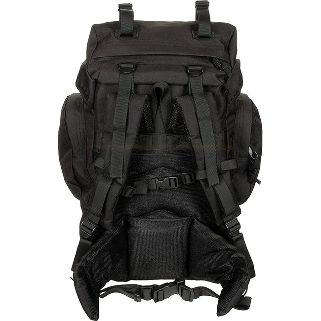 Sac à dos tactique MFH Large - Noir : Bretelles de taille/épaules ajustables et rembourrées, sangle de poitrine détachable, structure en aluminium, rembourrages en maille respirante, poignée de transport supérieure, fermeture éclair à l'arrière, plusieurs