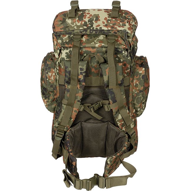 Sac à dos tactique MFH Large - Flecktarn : Bretelles réglables et matelassées, sangle de poitrine détachable, armature en aluminium, rembourrages en maille respirante, multiples compartiments, capacité de 55l. Idéal pour la randonnée et le camping.