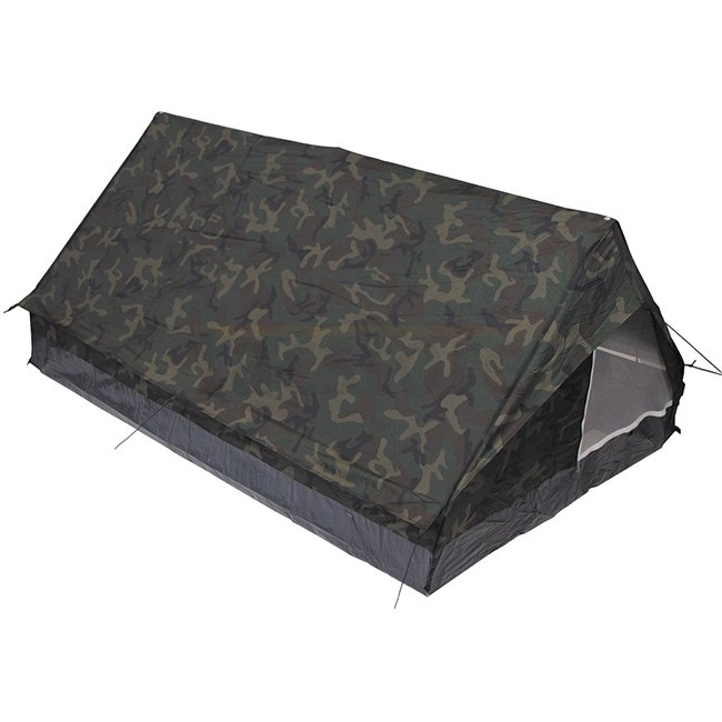 Tente MFH Minipack - Woodland : Tente à simple paroi avec des poteaux en métal divisibles, entrée avec moustiquaire, toile de sol robuste en PU, piquets en acier, cordes de haubanage et sac de transport. Colonne d'eau : 1500 mm. Taille du paquet : environ