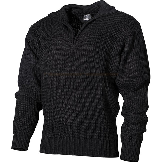 Pull à fermeture éclair en noir avec zip dissimulé sur le col et tricot grossier. Fabriqué en matière 100% acrylique.