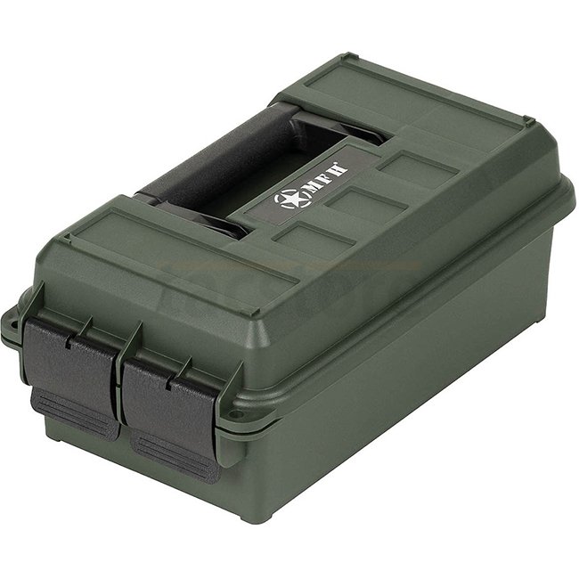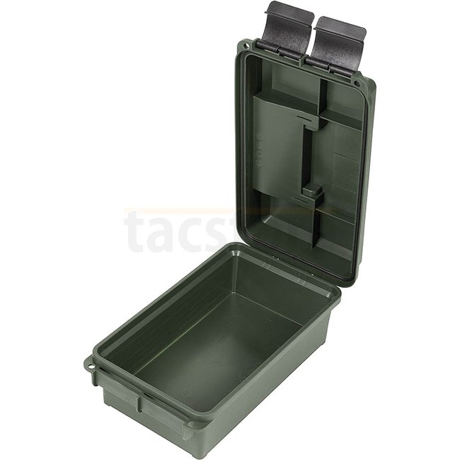 Boîte à munitions US MFH en plastique - Olive. Antichoc, étanche, couvercle avec joint en caoutchouc, poignée verrouillable, 2 verrous à pression, empilable. Dimensions : 34 x 19,5 x 13,5 cm. Poids : 660g.