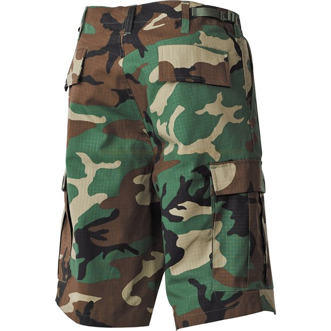 Shorts Bermuda MFH US en ripstop de couleur Woodland, taille 3XL. Fabriqués en 100 % coton. Caractéristiques : braguette à bouton, 6 poches, ceinture réglable et passants de ceinture extra larges.