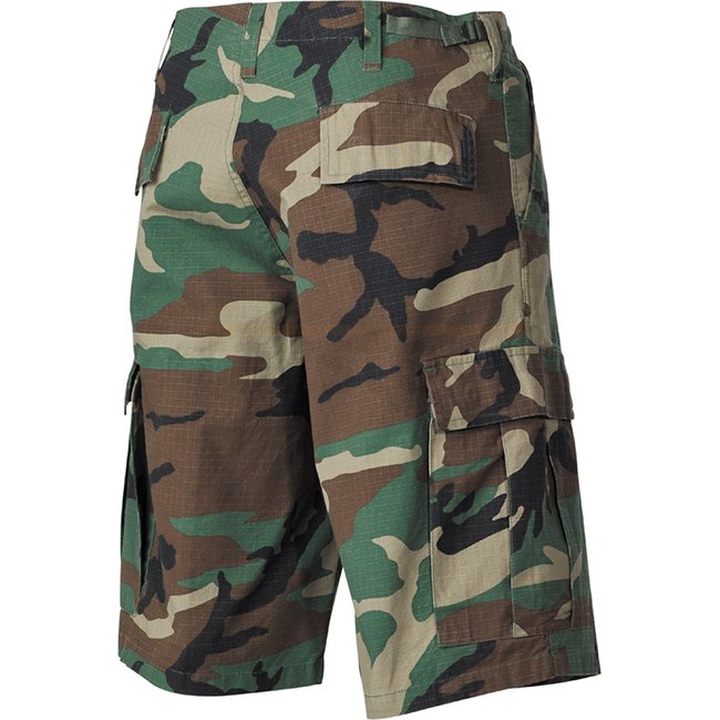 MFH US Bermuda Shorts Ripstop en Woodland Stonewashed, taille 2XL. Fermeture à bouton, 6 poches, taille ajustable et passants de ceinture larges. Fabriqué en 100% coton.
