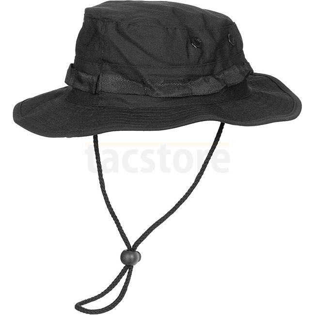 Chapeau de brousse MFH US en noir, taille M. Bord multi-matelassé, boucles périphériques, 4 œillets de ventilation avec mesh, et une jugulaire avec bloque-cordon. Fabriqué en 100% coton.