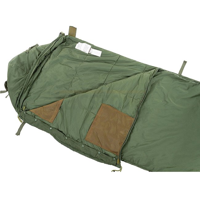 Sac de couchage HighDefence GB en olive - léger, design modulaire avec moustiquaire enroulable, partie supérieure en forme de capuche, poches en mesh, zone d'épaule ajustable et zip sur toute la longueur. Produit polyvalent adapté à diverses activités de