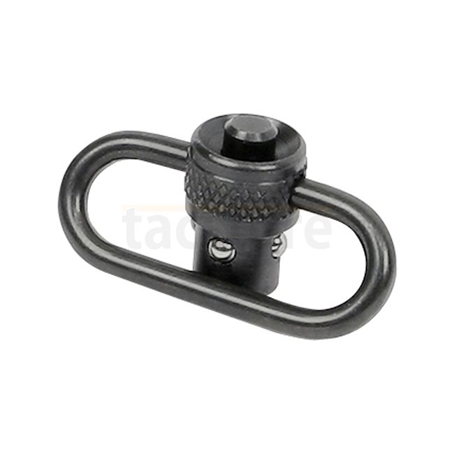 Le 1.25 Inch Quick Detach Sling Swivel est conçu pour des sangles d'environ 32mm (1.25"). Il offre une construction entièrement en acier, une libération rapide par bouton poussoir et une finition Black Oxide. Fabriqué à 100% aux USA.