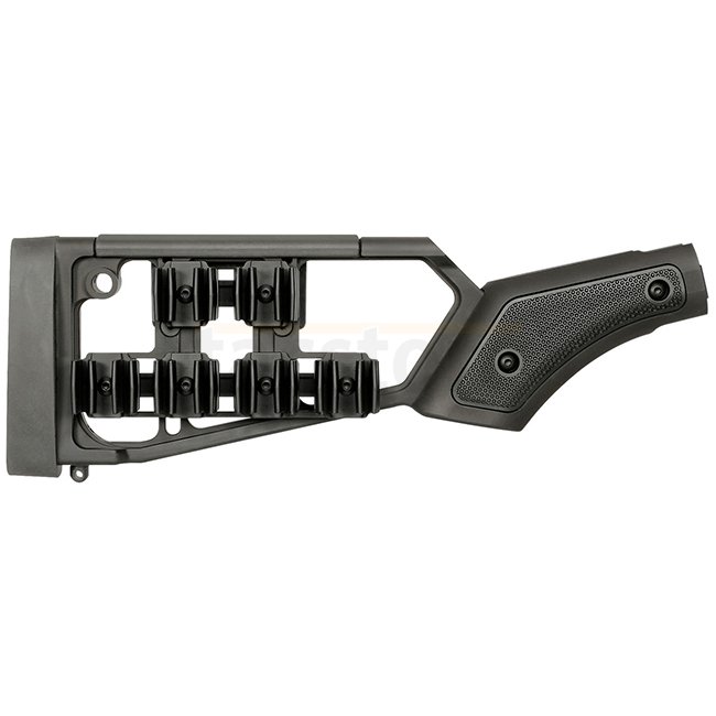 Le Lever Stock Shell Holder Plate Bundle de Midwest Industries comprend une plaque de montage et six supports de cartouches universels. Il permet de transporter jusqu’à 12 cartouches supplémentaires directement sur l’arme. La plaque est conçue dans un design squeletté léger, fabriquée en aluminium 6061 avec anodisation dure, et permet le montage des supports de cartouches à la verticale ou à l’horizontale.