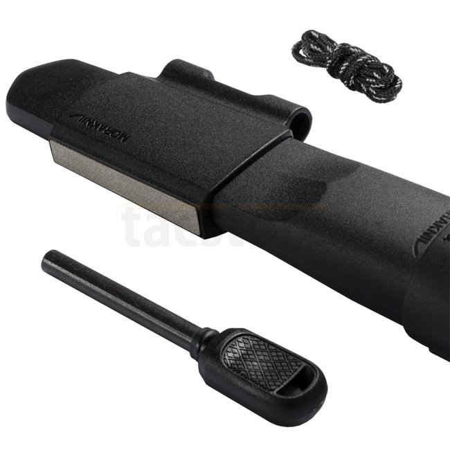 Morakniv Garberg & Kit de Survie - Noir. Un couteau en acier inoxydable de haute qualité avec une lame de 109 mm, parfait pour les situations de survie. Comprend des outils et des matériaux essentiels pour les aventures en plein air. Léger et durable, ne