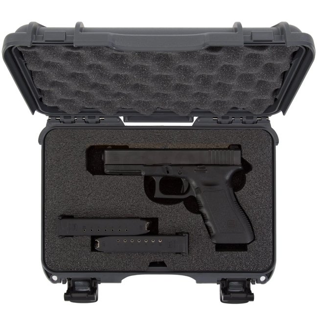 Boîtier robuste en résine NK-7 avec fermetures PowerClaw et soupape d’égalisation automatique. L’édition Glock comprend un insert en mousse à cellules fermées prédécoupé pour 1 pistolet et des chargeurs, pour un transport sûr et ordonné.