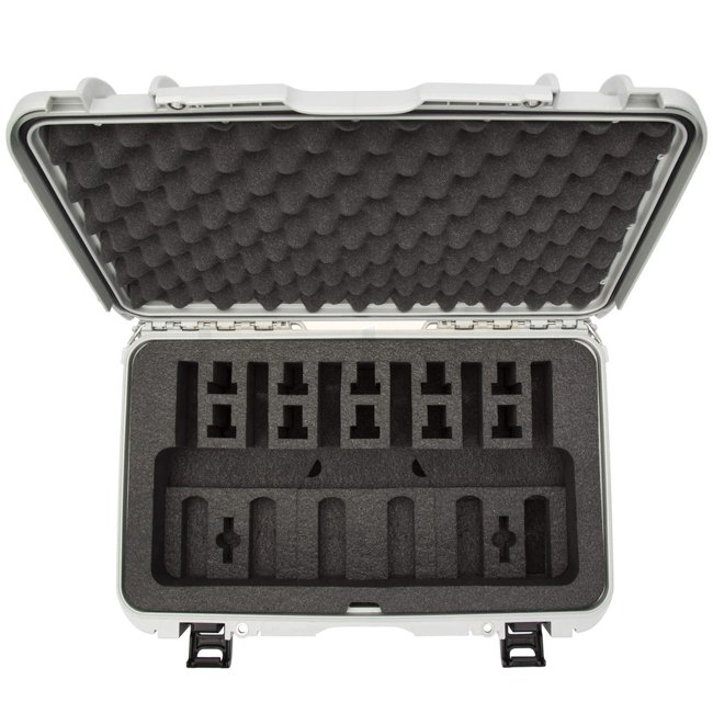 Boîtier robuste à roulettes en résine NK-7 équipé du système de verrouillage PowerClaw, d’une valve automatique d’égalisation, d’une poignée Soft-Grip et de ferrures en acier inoxydable. Cette version usine comprend une insert mousse prédécoupée à cellules fermées, conçue pour accueillir jusqu’à 6 pistolets (vertical) et jusqu’à 10 chargeurs; l’insert est amovible et reconfigurable.