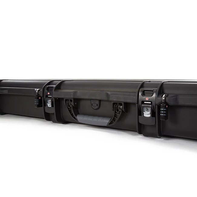Grand boîtier à roulettes robuste en résine NK-7 avec système de verrouillage PowerClaw, valve d’égalisation automatique, poignée Soft-Grip, poignées ressort et roues en polyuréthane. Cette version est équipée de deux verrous PowerClaw acceptés par la TSA pour un verrouillage sécurisé et adapté aux déplacements.