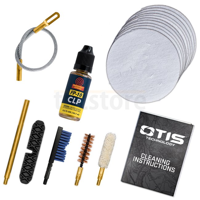 Kit de nettoyage de pistolet essentiel Otis compact pour pistolets .45cal. Fabriqué aux USA, rangé dans un étui rigide de 22x13x4cm. Inclut 10x tampons en coton de 3 pouces, Patch saver®, une brosse, un embout fendu, une brosse de calibre .45cal et une mo