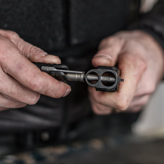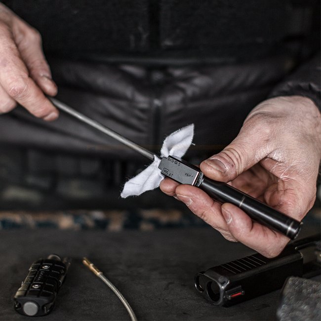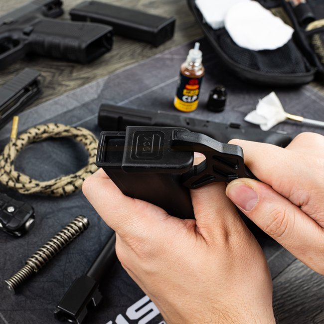 Kit de nettoyage conçu pour les pistolets Glock de 9 mm, cal .40 et cal .45, rangé dans un étui souple mesurant 25 x 9 x 3 cm. Fabriqué aux USA.