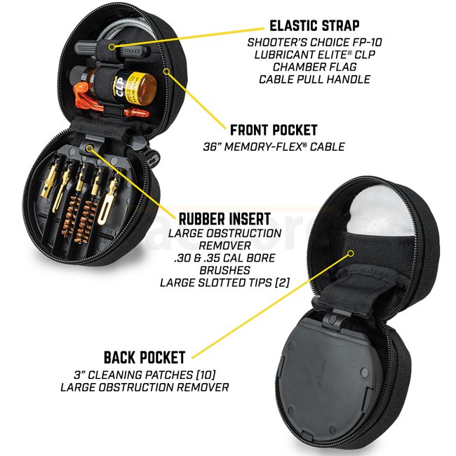Kit de nettoyage conçu pour les carabines de calibre .308, .300 Win Mag et .338, rangé dans un étui souple mesurant 10 x 10 x 6 cm. Fabriqué aux USA.