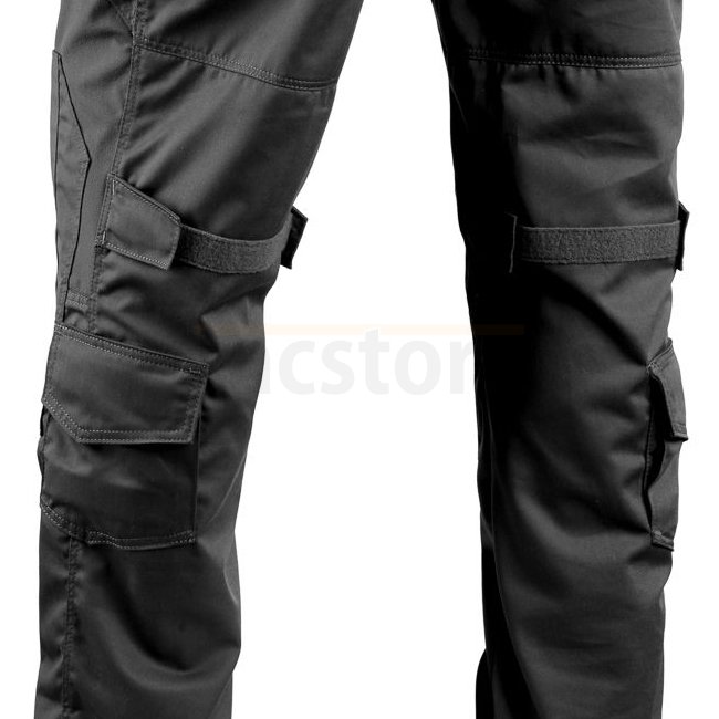 Les poches sur les cuisses volontairement placées vers l'avant, accessibles également en position assise grâce à de larges ouvertures et des fermetures éclair verticales, ainsi que des poches de communication à double renfort placées juste à côté, accueillent le matériel fréquemment utilisé. Les poches principales peuvent également être fermées avec un gros bouton, avec du velcro ou les deux à la fois. Les poches arrière inclinées restent accessibles même lorsque l'équipement est transporté sur une large ceinture de combat.