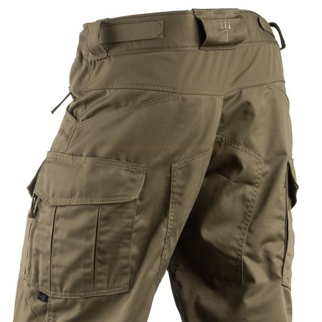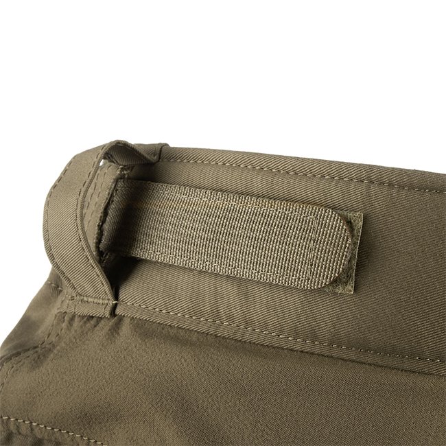 Les poches sur les cuisses volontairement placées vers l'avant, accessibles également en position assise grâce à de larges ouvertures et des fermetures éclair verticales, ainsi que des poches de communication à double renfort placées juste à côté, accueillent le matériel fréquemment utilisé. Les poches principales peuvent également être fermées avec un gros bouton, avec du velcro ou les deux à la fois. Les poches arrière inclinées restent accessibles même lorsque l'équipement est transporté sur une large ceinture de combat.