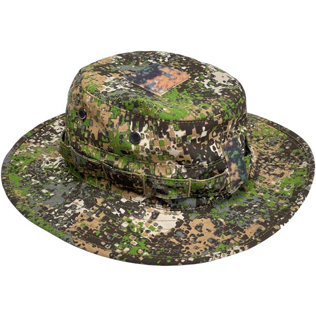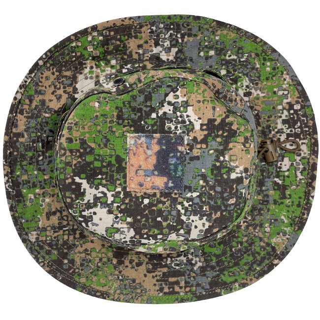 Tout en conservant la forme classique d'un bonnet Boonie, le haut est légèrement incliné et mesure 40mm de haut à l'avant et 50mm à l'arrière. Sur la partie supérieure, une surface de boucle de 50 x 50mm peut être trouvée pour attacher un patch réfléchissant infrarouge. Sur les côtés, on peut trouver des oeillets pour la circulation de l'air: suffisamment petits pour empêcher la pluie, suffisamment grands pour assurer une ventilation de base. Autour du chapeau, nous avons utilisé le même matériau polyester-coton au lieu d'une sangle rigide, garantissant ainsi une signature infrarouge faible. Sous la circonférence, un cordon de serrage est cousu, ce qui permet un réglage de la taille. En continu pour un ajustement parfait, en maintenant la taille choisie à l’aide d’un bloqueur de cordon à l’arrière. Le bord est légèrement moins large que d'habitude. Juste parfait comme on trouve. Toutes les autres caractéristiques des modèles standard, telles que la mentonnière ou un protège-nuque, ont été laissées de côté. Fonctionnalité par simplicité.