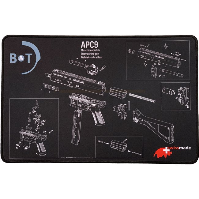 Tapis de table de qualité supérieure pour l'entretien des armes ou pour protéger les surfaces. Compact, 43 cm x 28 cm avec une épaisseur de 3 mm. Vues éclatées détaillées des composants de l'arme. Logo officiel de B&T avec permission de B&T Thun AG Suisse