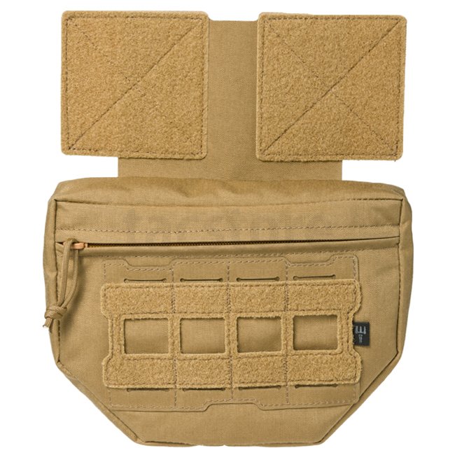 La poche avant est dotée d'un velcro à l'intérieur pour permettre l'installation d'accessoires supplémentaires tels que des organisateurs ou un étui. Les boucles MOLLE Laser-Cut à l'avant sont utilisées pour le montage de pochettes supplémentaires, ce qui est particulièrement intéressant si la Drop Fanny Protector Pouch n'est pas accessible, par exemple en raison de poches de magazines en saillie sur le porte-plaque. Cependant, les boucles MOLLE ont également une surface velcro pour le montage des patches d'identification. De plus, puisque les bandes médianes ne sont pas cousues ensemble avec la poche, un porte-tourniquet peut être bouclé et maintenu en place en toute sécurité.