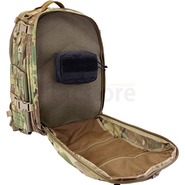 Une grande surface découpée au laser permet l'installation des poches basés sur le système MOLLE sur le sac à dos pour augmenter encore sa capacité. En option, un cordon de choc zigzague sur toute la face arrière créant un filet pour contenir des objets légers comme une veste. Sur le dessus, il est maintenu en place par un crochet avec des capacités détachables rapidement et sur le fond, le cordon de choc peut être enroulé à travers un œillet et fixé par un arrêt de cordon.