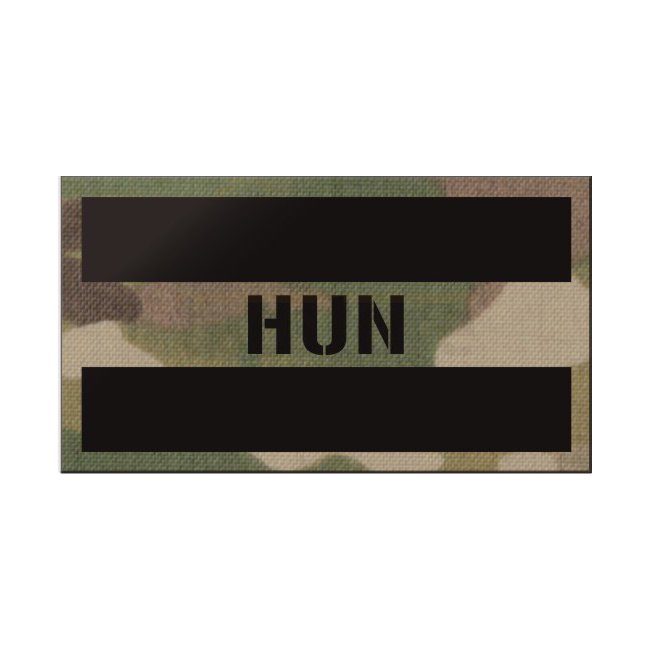 Pitchfork Hungary IR Écusson à Imprimer en design Multicam, présentant des dimensions de 90 x 50 mm et fabriqué avec un film IR imprimé sur le devant et une surface à crochet au dos.