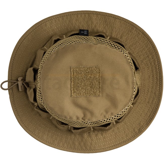 Tout en conservant la forme classique du chapeau boonie, la couronne est maintenue à plat pour un profil bas. Un tissu en maille est utilisé tout autour, ce qui permet une circulation d'air maximale. Sur la partie supérieure, une surface de boucle de 50 x 50mm peut être trouvée pour attacher un patch réfléchissant infrarouge. Autour du chapeau, nous avons utilisé le même matériau polyester-coton au lieu d'une sangle rigide, garantissant ainsi une signature infrarouge faible. Sous la circonférence, un cordon de serrage est cousu, ce qui permet un réglage de la taille. En continu pour un ajustement parfait, en maintenant la taille choisie à l’aide d’un bloqueur de cordon à l’arrière. Le bord est maintenu extra étroit. Toutes les autres caractéristiques des modèles standard, telles que la mentonnière ou un protège-nuque, ont été laissées de côté. Fonctionnalité par simplicité.