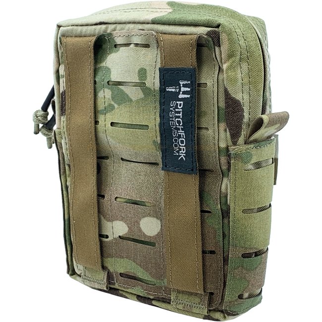 La pochette utilitaire verticale petite Pitchfork - Multicam est une pochette de surface du système MOLLE avec des bandes Velcro, des boucles élastiques et une poche en maille pour les accessoires. Idéale pour une trousse de premiers secours ou le rangeme