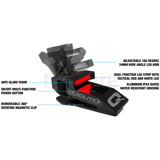 Présentation de QuiqLite X2 en boîtier en aluminium rechargeable USB - Rouge / Blanc. Les caractéristiques incluent un nouveau boîtier en aluminium, rechargeable par USB, 4 modes avec différents lumens, finition anodisée anti-reflet, bras LED réglable, bo
